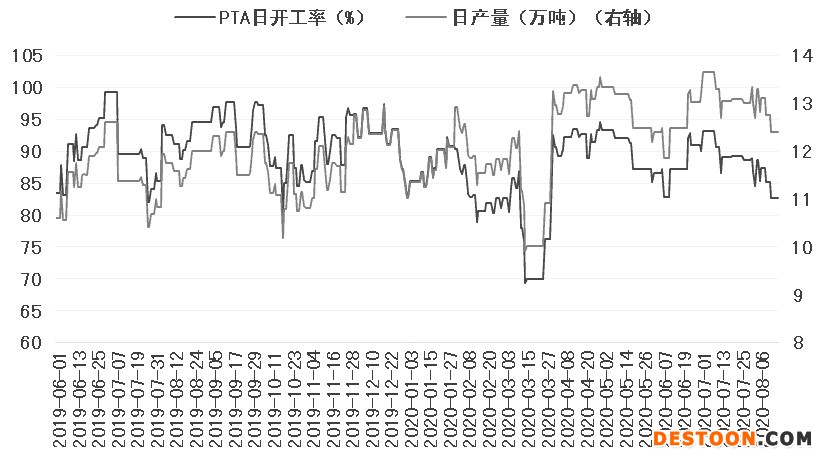 2020年7月末至8月初,寧波臺(tái)化等5套共計(jì)487.5萬(wàn)噸/年產(chǎn)能PTA裝置停車檢修,福海創(chuàng)450萬(wàn)噸/年裝置亦降負(fù)至七成運(yùn)行,國(guó)內(nèi)PTA日度開(kāi)工率出現(xiàn)明顯下降。截至8月17日,國(guó)內(nèi)PTA裝置開(kāi)工率為82.64%,環(huán)比7月同期下降6.44個(gè)百分點(diǎn)。