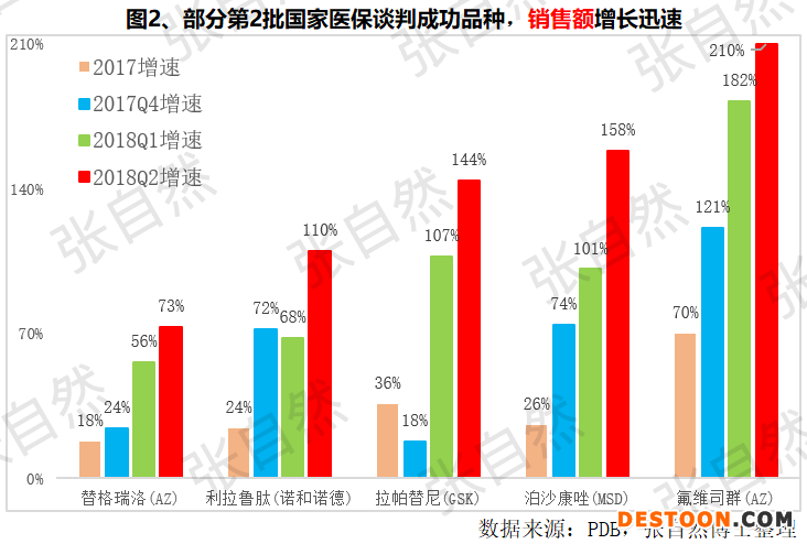 以2017年第二批談判成功的阿斯利康的氟維司群為例,由于國談品種在下半年才逐漸落地,所以其2017年銷售額整體增速只有70%,但2017年第四季度增速則大漲,高達121%,2018年的第一、二季度增速更是高達182%和210%,企業(yè)通過醫(yī)保談判達到了以價換量的效果(圖2)。