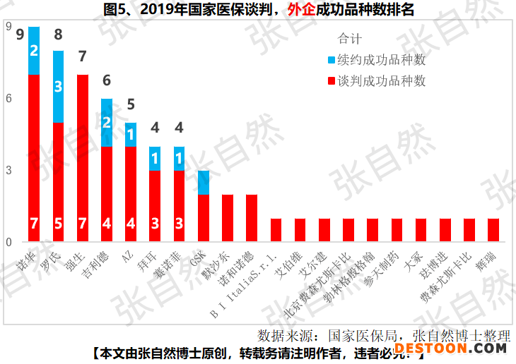 2019國談受益最大的外企是諾華,共有9個品種談判成功,其中7個是新增、2個是續(xù)約成功,其后依次是羅氏8個(含續(xù)約3個)、強生7個、吉利德6個(含續(xù)約2個)、AZ5個(含續(xù)約1個)(圖5)。