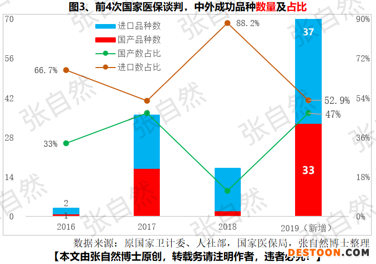近年來,國內掀起了醫(yī)藥創(chuàng)新的高潮,也取得了明顯的效果,很多本土藥企的新藥獲批,因此在2019年的第四次國談中,國產藥表現出色;在新增談判成功的70個藥品中,國產的占了33個(其中有8個屬于國家重大專項),進口的有37個,國產占比高達47%;當然,在國產的37個中包含了18個中藥(圖3),不過從國談也可感到我國醫(yī)藥創(chuàng)新的前進速度和驚人成績。