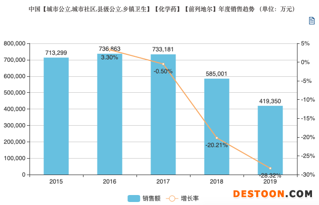 例如前列地爾,從2017年開始市場就呈現(xiàn)逐年下滑趨勢,從2018年負增長越來越明顯。