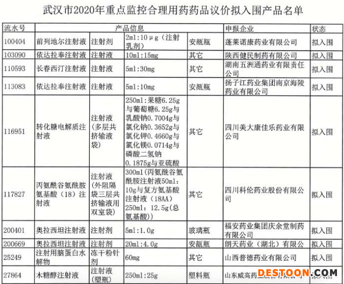 根據(jù)通知,武漢市2020年重點監(jiān)控合理用藥藥品議價報價工作已經(jīng)結(jié)束,現(xiàn)將企業(yè)和產(chǎn)品申報信息審核情況及擬入圍結(jié)果公示,公示時間為8月18日至8月24日。