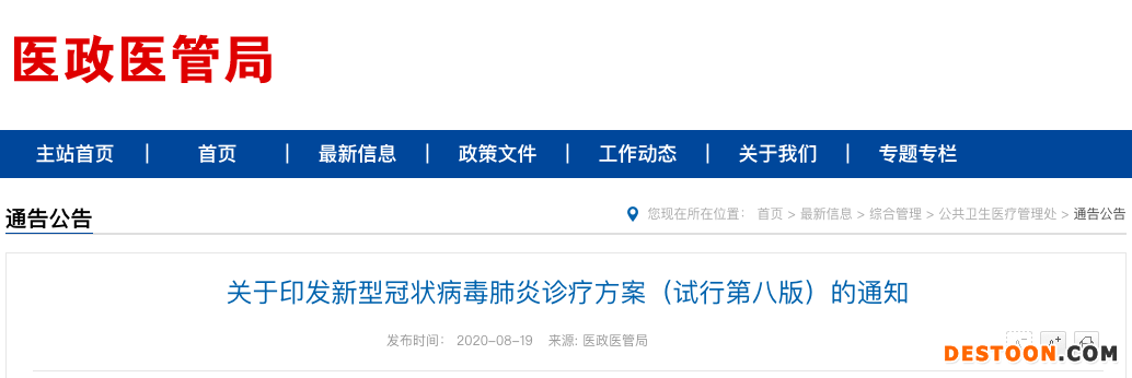 8月20日訊 8月19日,國(guó)家衛(wèi)健委發(fā)布《關(guān)于印發(fā)新型冠狀病毒肺炎診療方案(試行第八版)的通知》。