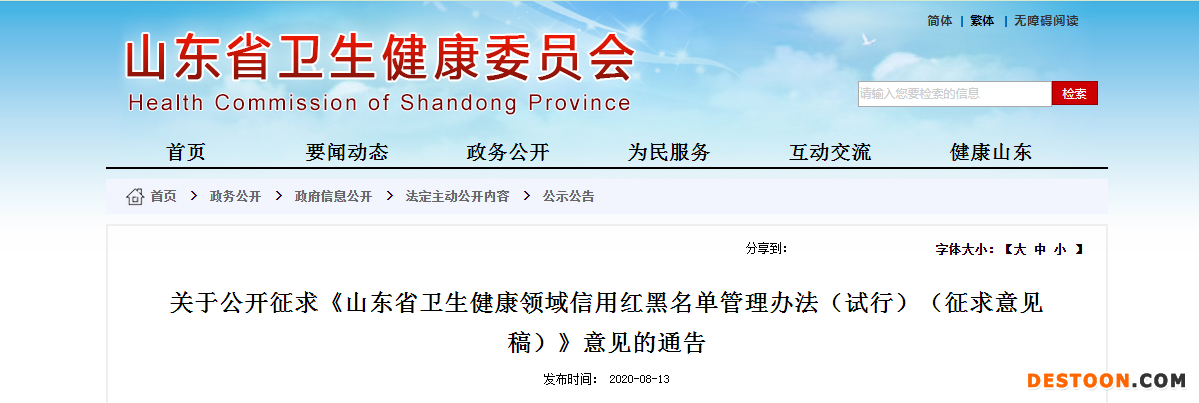 醫(yī)藥網(wǎng)8月21日訊 近日,山東省衛(wèi)生健康委發(fā)布關(guān)于公開征求《山東省衛(wèi)生健康領(lǐng)域信用紅黑名單管理辦法(試行)(征求意見稿)》(以下簡(jiǎn)稱《征求意見稿》)意見的通告。