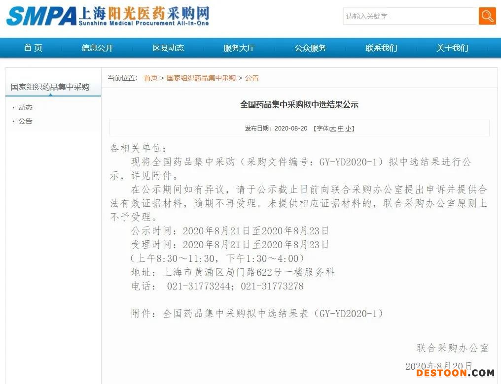 現(xiàn)將全國藥品集中采購(采購文件編號:GY-YD2020-1)擬中選結(jié)果進行公示,詳見附件。