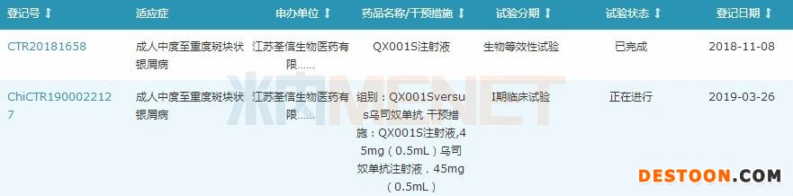 目前全球范圍內(nèi)尚無烏司奴單抗生物類似藥獲批,國內(nèi)也僅有荃信生物(QX001S注射液)、百奧泰(BAT2206注射液)兩家公司的產(chǎn)品先后獲批臨床。