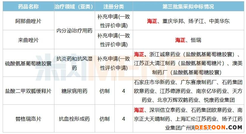 截至目前,海正藥業(yè)及子公司共有14個產(chǎn)品已過評(含瀚暉制藥已過評的4個產(chǎn)品),其中5個產(chǎn)品參與第三批國家集采競標(biāo),阿那曲唑片、來曲唑片、硫酸氨基葡萄糖膠囊、替格瑞洛片擬中選,而鹽酸二甲雙胍緩釋片則失之交臂。
