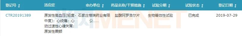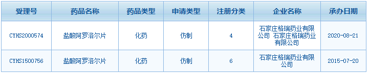 圖1:石家莊格瑞藥業(yè)的鹽酸阿羅洛爾片的注冊(cè)情況
