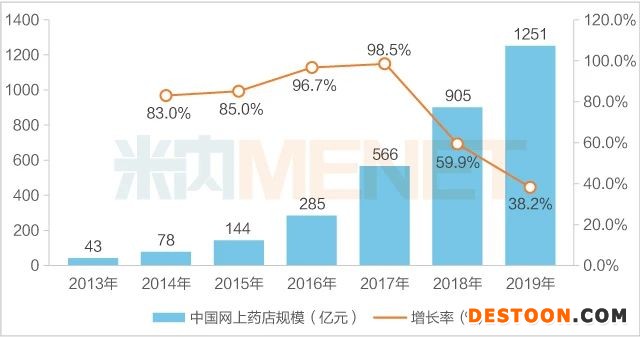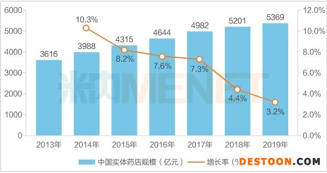 2019年中國網(wǎng)上藥店銷售規(guī)模突破千億大關(guān),為1251億元,同比增長38.2%,與前幾年的高速增長相比,增速有所放緩;而實體藥店(含藥品和非藥品)2019年銷售規(guī)模為5369億元,同比增長3.2%。