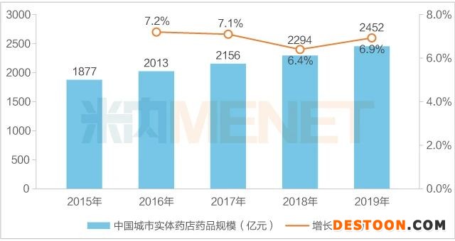 2019年“中國城市實體藥店”藥品規(guī)模達2452億元,增速為6.9%,較2018年上漲0.5個百分點,原因是近兩年獲批的單抗、替尼類抗腫瘤新藥,通過DTP藥房等院外渠道進行銷售,拉動了中國城市實體藥店規(guī)模的增長。“中國縣鄉(xiāng)村實體藥店”藥品規(guī)模為1605億元,較2018年增長5.2%。