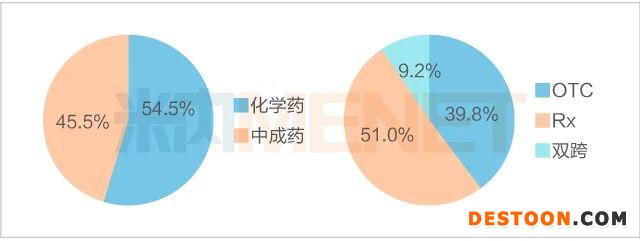 2019年中國城市實體藥店(含地級及以上城市)藥品銷售規(guī)模中,化學藥占比54.5%,較2018年上升3.2個百分點;此消彼長之下,中成藥占比下滑至45.5%。從藥品類型看,處方藥占半壁江山,市場份額為51.0%,較2018年上升2.7個百分點,非處方藥占39.8%,雙跨占9.2%,可見處方外流成效顯著,DTP藥房等院外渠道做出的貢獻也愈發(fā)明顯。