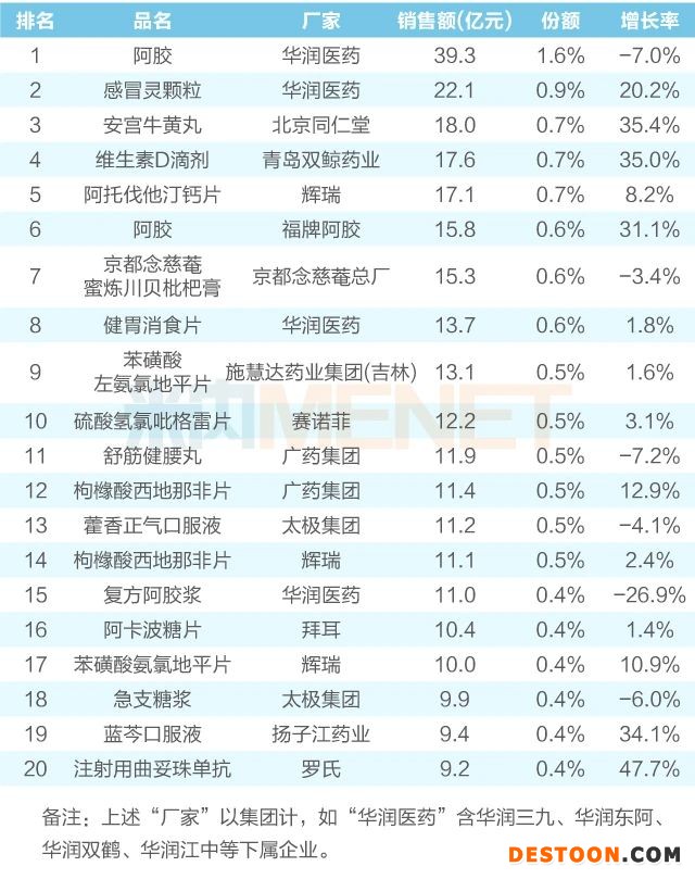 華潤醫(yī)藥成為最大贏家,有4個產(chǎn)品上榜,均為中成藥。其中阿膠的銷售額接近40億元,遙遙領(lǐng)先;感冒靈顆粒排在第二位,銷售額超22億元,健胃消食片及復方阿膠漿分別排在第八、第十五位,銷售額也達到了13億元、11億元級別。