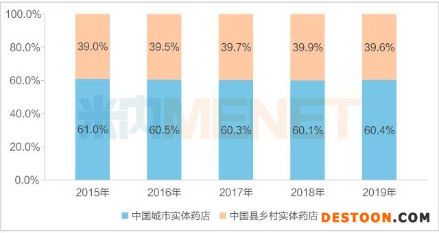 米內(nèi)網(wǎng)推出的《中國城市實體藥店化學藥與中成藥終端競爭格局》數(shù)據(jù)顯示,2019年“中國城市實體藥店”(指:地級及以上城市實體藥店)藥品規(guī)模占中國實體藥店藥品規(guī)模60.4%;“中國縣鄉(xiāng)村實體藥店”(指:非地級城市,也就是縣鄉(xiāng)村實體藥店)藥品規(guī)模占比達39.6%。