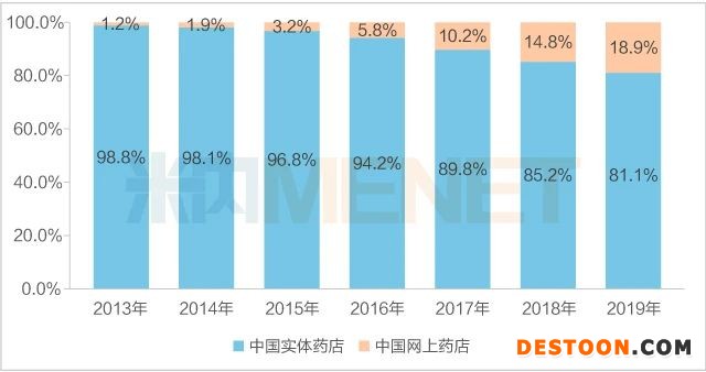 圖2:2013-2019年中國實體藥店和網(wǎng)上藥店(含藥品和非藥品)銷售額占比
