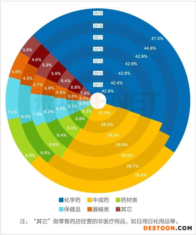 圖5:2013-2019年中國實體藥店(含藥品和非藥品)各品類結(jié)構(gòu)變化