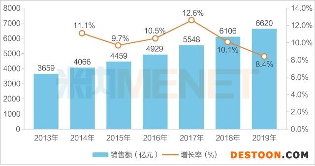 圖6:2013-2019年中國實體藥店藥品銷售情況