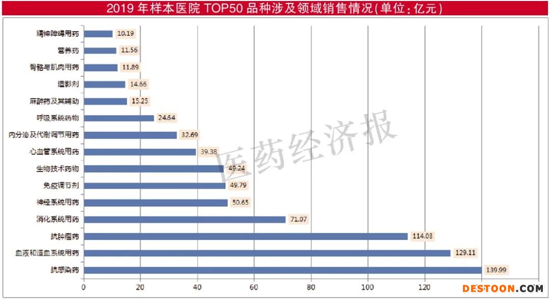 TOP50品種涉及的領(lǐng)域有:抗感染藥用藥金額139.99億元,血液和造血系統(tǒng)用藥129.11億元,抗腫瘤藥114.03億元,消化系統(tǒng)用藥71.07億元,神經(jīng)系統(tǒng)用藥50.65億元,其它幾個領(lǐng)域(免疫調(diào)節(jié)劑、生物技術(shù)藥物、心血管系統(tǒng)用藥、內(nèi)分泌及代謝調(diào)節(jié)用藥、呼吸系統(tǒng)藥物、麻醉藥及其輔助造影劑、骨骼與肌肉用藥、營養(yǎng)藥、精神障礙用藥)合計用藥金額259.29億元。