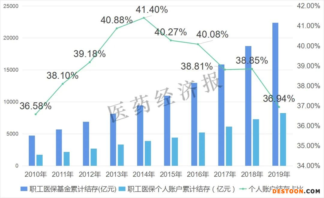 單從累計結余情況看,2010-2019年職工醫(yī)保個人賬戶累計結余從1734.1億元增長到8276.5億元,平均增速18.96%,增速略大于統(tǒng)籌基金累計結余增速(18.83%)。而個人賬戶累計結存在近兩年的多方政策的推動下,占職工醫(yī)保累計結余的比例基本與2010年持平。