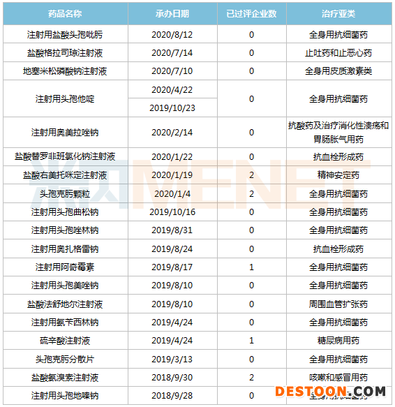 除鹽酸右美托咪定注射液、鹽酸氨溴索注射液、頭孢克肟顆粒、注射用阿奇霉素、硫辛酸注射液5個品種外,其余14個在審品種還未有企業(yè)過評;地塞米松磷酸鈉注射液、注射用頭孢美唑鈉、注射用氨芐西林鈉、注射用頭孢地嗪鈉、注射用奧扎格雷鈉5個品種由成都倍特首家申報一致性評價,其中地塞米松磷酸鈉注射液、注射用氨芐西林鈉為獨家申報。