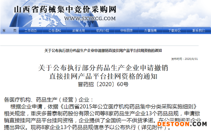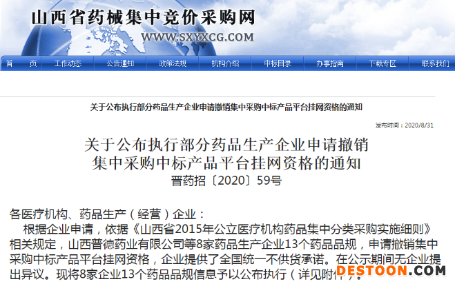 山西發(fā)布的通知顯示,根據(jù)企業(yè)申請,依據(jù)《山西省2015年公立醫(yī)療機構(gòu)藥品集中分類采購實施細則》相關(guān)規(guī)定,山西普德藥業(yè)有限公司等8家藥品生產(chǎn)企業(yè)13個藥品品規(guī)申請撤銷集中采購中標產(chǎn)品平臺掛網(wǎng)資格;重慶多普泰制藥股份有限公司等8家藥品生產(chǎn)企業(yè)13個藥品品規(guī)則申請撤銷直接掛網(wǎng)產(chǎn)品平臺掛網(wǎng)資格。這些企業(yè)均提供了全國統(tǒng)一不供貨承諾。