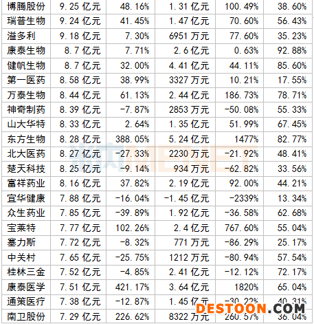 凈利潤TOP10中,邁瑞醫(yī)療、恒瑞醫(yī)藥、云南白藥等5家超過20億元。其中,“醫(yī)械一哥”邁瑞醫(yī)療以34.54億元居首位,恒瑞醫(yī)藥則緊跟其后;維生素龍頭企業(yè)新和成凈利潤增速最快,高達(dá)91.41%。