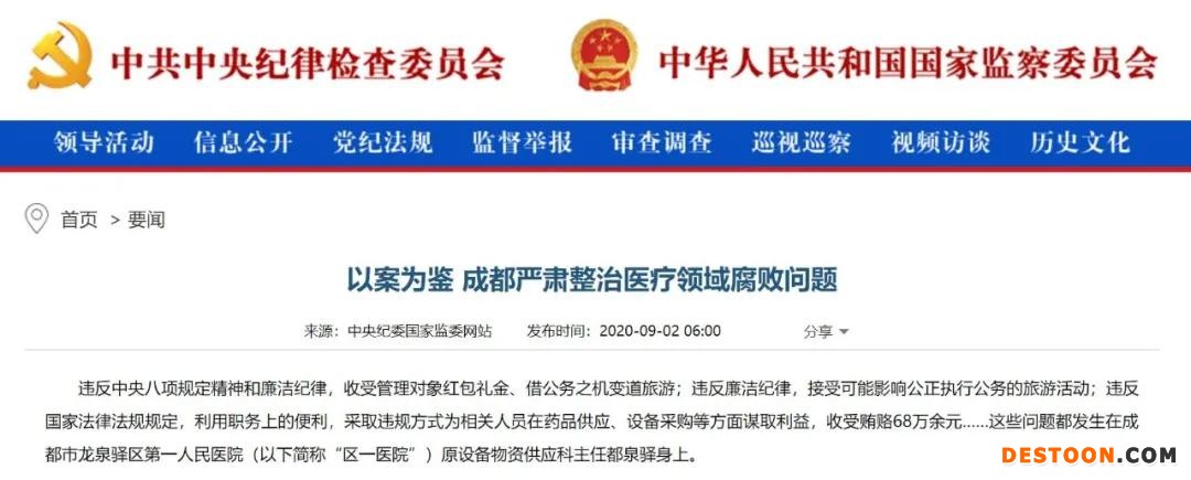 9月3日訊 9月2日,中共中央紀(jì)律檢查委員會(huì)官網(wǎng)發(fā)布要聞《以案為鑒 成都嚴(yán)肅整治醫(yī)療領(lǐng)域腐敗問(wèn)題》,案例曝光違反中央八項(xiàng)規(guī)定精神和廉潔紀(jì)律,醫(yī)務(wù)人員收受管理對(duì)象紅包禮金、借公務(wù)之機(jī)變道旅游;違反廉潔紀(jì)律,接受可能影響公正執(zhí)行公務(wù)的旅游活動(dòng);違反國(guó)家法律法規(guī)規(guī)定,利用職務(wù)上的便利,采取違規(guī)方式為相關(guān)人員在藥品供應(yīng)、設(shè)備采購(gòu)等方面謀取利益的違法違紀(jì)行為。