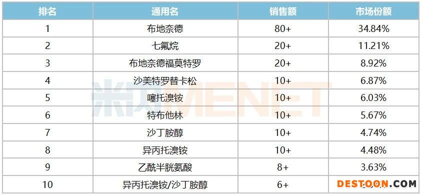 表1:中國公立醫(yī)療機(jī)構(gòu)終端化學(xué)藥吸入劑TOP10品種(單位:億元)