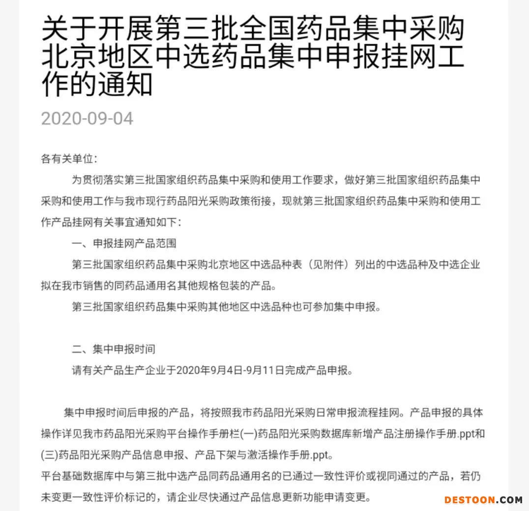 9月4日,北京市藥品陽光采購微平臺發(fā)布《關(guān)于開展第三批全國藥品集中采購北京地區(qū)中選藥品集中申報掛網(wǎng)工作的通知》,安排第三批國家組織藥品集中采購和使用工作產(chǎn)品掛網(wǎng)有關(guān)事宜。