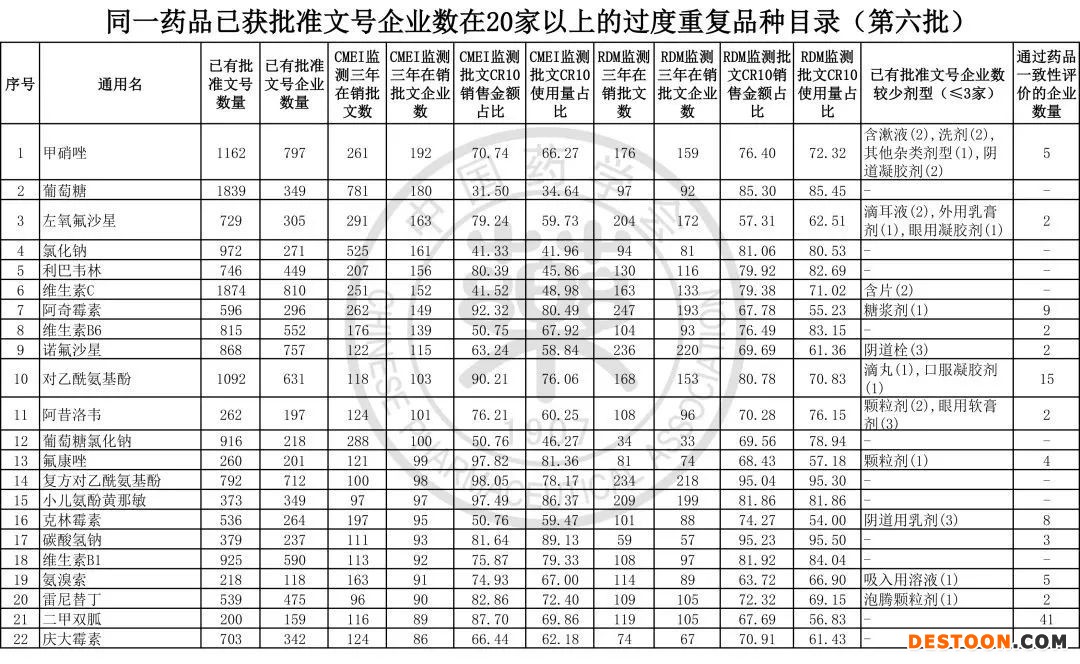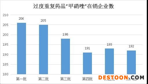 自2014年9月原國家食藥監(jiān)總局公布《第一批過度重復(fù)藥品品種目錄》,目前已是第六批。梳理公布的目錄發(fā)現(xiàn),過度重復(fù)藥品已經(jīng)有大量企業(yè)生產(chǎn)或正在申報(bào)投產(chǎn),市場(chǎng)需求已經(jīng)飽和或者接近飽和。