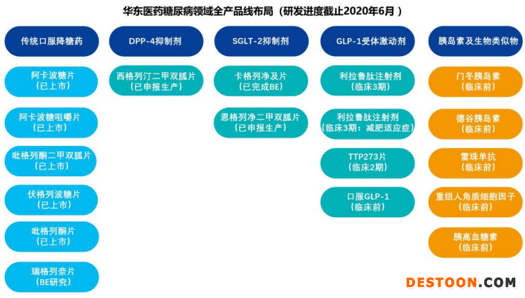 為保持國內(nèi)糖尿病市場(chǎng)領(lǐng)先地位,華東醫(yī)藥在糖尿病領(lǐng)域形成創(chuàng)新靶點(diǎn)加差異化仿制藥產(chǎn)品管線的整體布局,從仿制+創(chuàng)新+生物大分子三個(gè)維度,構(gòu)筑了逐步升級(jí)、對(duì)核心治療靶點(diǎn)與臨床主流用藥全布局的產(chǎn)品矩陣。在研產(chǎn)品作用機(jī)制涵蓋DPP-4抑制劑、SGLT-2抑制劑、GLP-1創(chuàng)新藥及其類似物、胰島素類似物以及治療糖尿病并發(fā)癥的單抗等產(chǎn)品。