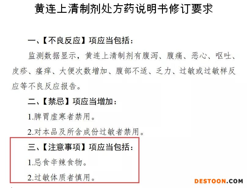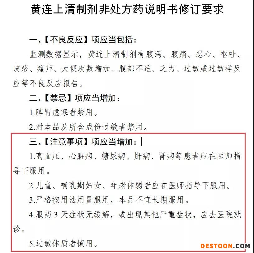 《公告》指出,根據(jù)藥品不良反應評估結果,為進一步保障公眾用藥安全,國家藥監(jiān)局決定對黃連上清制劑(包括丸劑、片劑、顆粒劑、膠囊劑)說明書【不良反應】【禁忌】和【注意事項】項進行統(tǒng)一修訂。