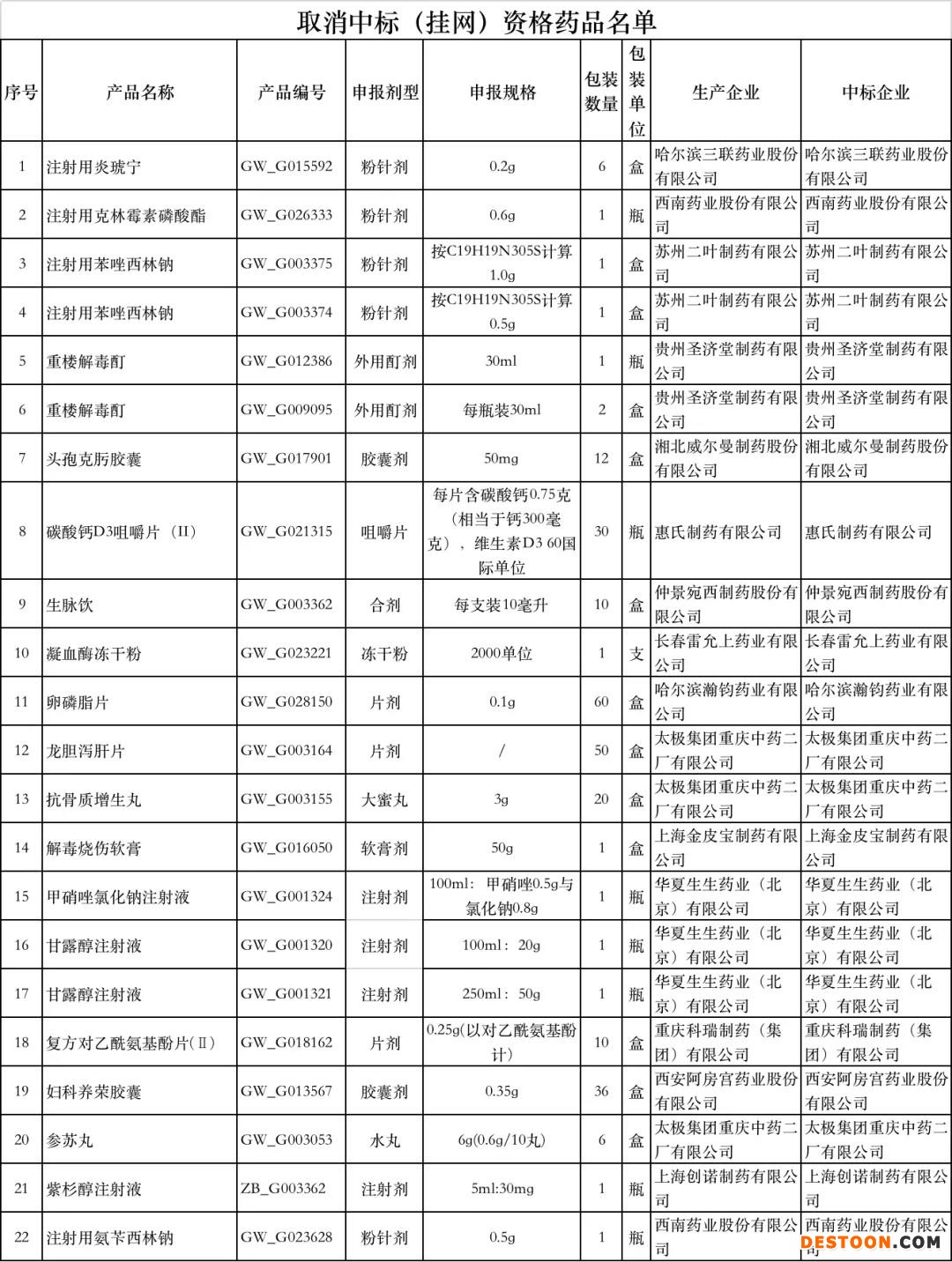 共有22個(gè)藥被取消中標(biāo)(掛網(wǎng))資格,且基本都為包括注射用炎琥寧、頭孢克肟膠囊、生脈飲在內(nèi)的常用大品種,涉及太極集團(tuán)重慶中藥二廠有限公司、西南藥業(yè)、蘇州二葉制藥有限公司等知名藥企。