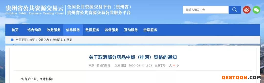 9月16日訊 9月14日,貴州省公共資源交易中心發(fā)布公告,取消部分藥品中標(biāo)(掛網(wǎng))資格的通知。