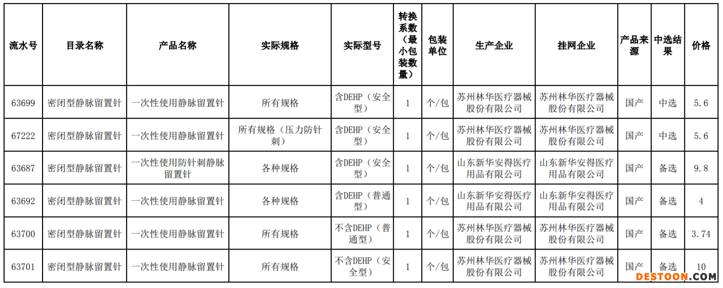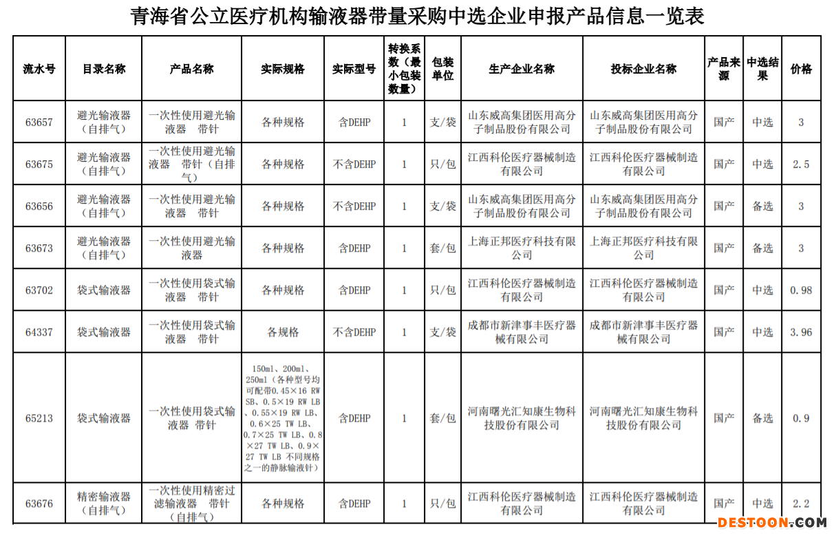 9月18日訊 9月15日,青海省藥品和醫(yī)用耗材集中采購網(wǎng)發(fā)布《關(guān)于公布青海省公立醫(yī)療機(jī)構(gòu)醫(yī)用耗材帶量采購中選企業(yè)申報(bào)產(chǎn)品信息的通知》,將留置針、輸液器帶量采購中選企業(yè)申報(bào)產(chǎn)品信息進(jìn)行公布。