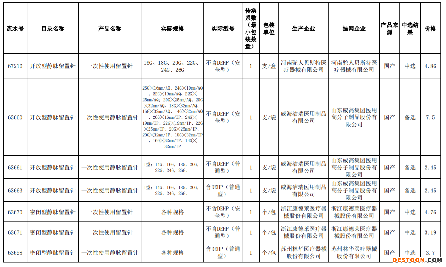 河南駝人貝斯特某款開放型靜脈留置針中選價(jià)格為4.86元。