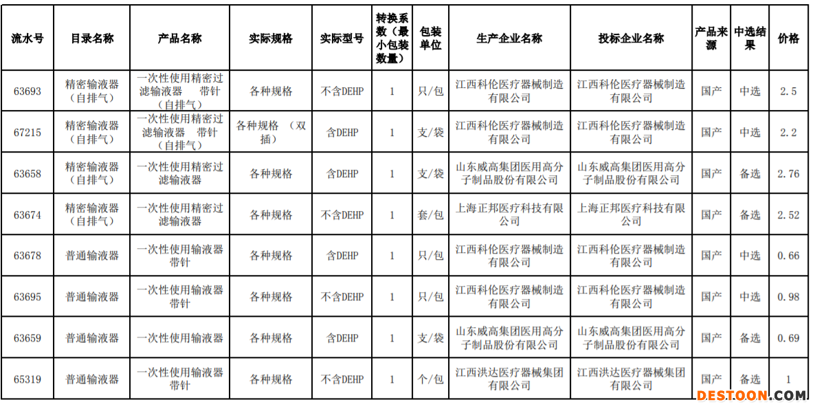 科倫醫(yī)療的某款精密輸液器(自排氣)中選價(jià)格為2.2元;