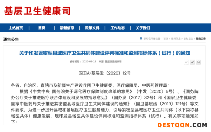 9月21日訊 9月18日,國家衛(wèi)健委基層衛(wèi)生健康司發(fā)布《關于印發(fā)緊密型縣域醫(yī)療衛(wèi)生共同體建設評判標準和監(jiān)測指標體系(試行)的通知》(以下稱《通知》),指出將進一步提升縣域和基層醫(yī)療衛(wèi)生服務能力,引導緊密型縣域醫(yī)療衛(wèi)生共同體(以下簡稱縣域醫(yī)共體)健康發(fā)展。
