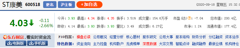 9月3日,ST康美復牌,受到此利好消息刺激,連續(xù)9個交易日漲停,在此期間,因股價連續(xù)漲停,ST康美多次發(fā)布風險提示公告;9月16日,ST康美開盤漲停,正當投資者以為第10個漲??梢允杖肽抑械臅r候,股價突然跳水,最終當天上演了“天地板”,以跌停收盤;9月17日,ST康美繼續(xù)跌停;截至9月18日收盤,市值200億元。對此,有業(yè)內(nèi)人士分析指出,由于ST股的基本面較差,投資者應注意風險,要理性看待、認真分析其原因和影響,避免盲目追漲,跟風炒作,造成不必要的損失。
