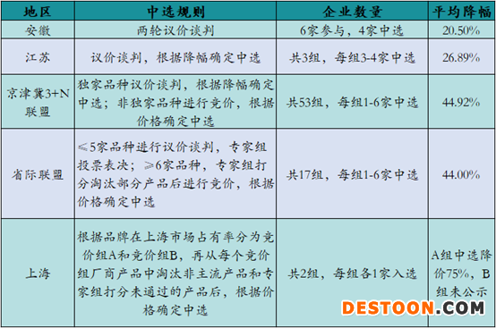 橫向?qū)Ρ戎羞x規(guī)則,在最初進行集采的安徽和江蘇兩個省份,由于參與企業(yè)較少,均采取了議價談判的方式。安徽省選擇兩輪議價,而江蘇省則根據(jù)降價的幅度確定中選品種。在參與的企業(yè)數(shù)量增多之后,京津冀3+N聯(lián)盟采用了分組的方式,較少品種的組采取議價的方式,而較多品種的組采取了競價的方式,這種競價議價結(jié)合的方式,可以在參加企業(yè)數(shù)量增加后,保證價格充分降低。在京津冀聯(lián)盟的競價規(guī)則基礎(chǔ)上,省際聯(lián)盟引入了專家組評分以保證最終中選產(chǎn)品的質(zhì)量,議價組根據(jù)專家組表決決定入選,而競價組首先根據(jù)專家打分淘汰部分產(chǎn)品后,再在剩余的產(chǎn)品中根據(jù)價格決定中選。上海市的集采規(guī)則放棄了議價組,但新增了市場占有率的因素,旨在降價的同時,不改變臨床的使用習(xí)慣。