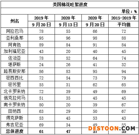 美國(guó)農(nóng)業(yè)部9月21日發(fā)布的美國(guó)棉花生產(chǎn)報(bào)告顯示,截至2020年9月20日,美國(guó)棉花吐絮進(jìn)度為57%,比去年同期減少4個(gè)百分點(diǎn),比過去五年平均值增加2個(gè)百分點(diǎn)。美國(guó)棉花收獲進(jìn)度為11%,比去年同期增加1個(gè)百分點(diǎn),較過去五年平均值增加1個(gè)百分點(diǎn)。美國(guó)棉花生長(zhǎng)狀況達(dá)到良好以上的占45%,與前周持平,較去年同期增加5個(gè)百分點(diǎn)。