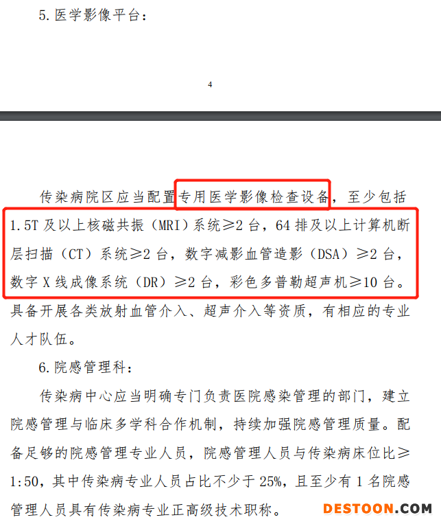 以及醫(yī)學影像檢查設(shè)備,包括1.5T及以上核磁共振(MRI)系統(tǒng)≥2臺,64排及以上計算機斷層掃描(CT)系統(tǒng)≥2臺,數(shù)字減影血管造影(DSA)≥2臺,數(shù)字X線成像系統(tǒng)(DR)≥2臺,彩色多普勒超聲機≥10臺。