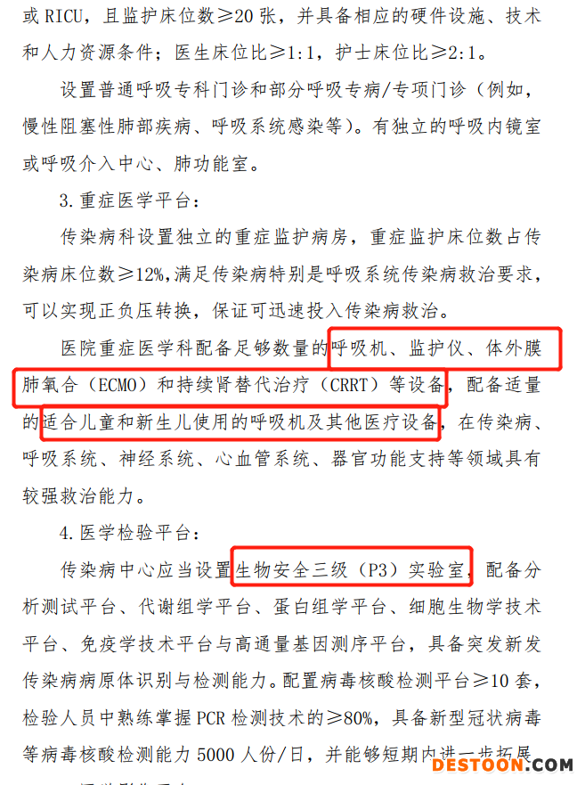 其中,要求重癥醫(yī)學科配備足夠數(shù)量的呼吸機、監(jiān)護儀、體外膜肺氧合(ECMO)和持續(xù)腎替代治療(CRRT)等設(shè)備,配備適量的適合兒童和新生兒使用的呼吸機及其他醫(yī)療設(shè)備。