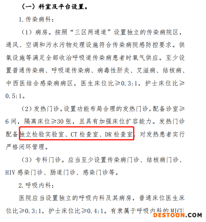 傳染病院區(qū)按照“三區(qū)兩通道”設(shè)置,傳染病救治床位數(shù)≥醫(yī)院編制床位數(shù)的20%。科室的配置上,應(yīng)由核心科室(專業(yè))和支撐科室(專業(yè))組成。