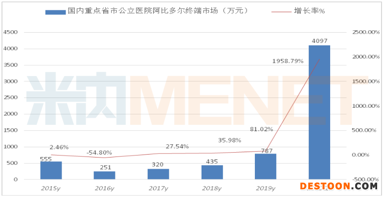 米內(nèi)網(wǎng)數(shù)據(jù)顯示,2020年一季度國(guó)內(nèi)重點(diǎn)省市公立醫(yī)院終端阿比多爾市場(chǎng)為4097萬(wàn)元,較上一年同期增長(zhǎng)1958.79%。