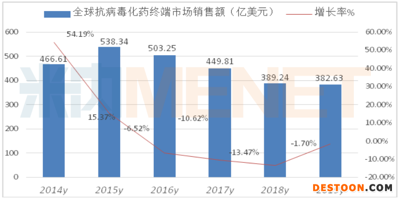 抗丙肝病毒藥物Sovaldi于2014年獨(dú)占鰲頭拿下百億美金市場(chǎng),2019年已有14個(gè)抗丙肝病毒藥物在市場(chǎng)上競(jìng)爭(zhēng),Sovaldi已成昨日黃花。2019年,全球抗丙肝病毒藥物總體市場(chǎng)相比峰值年下滑75%的形勢(shì)下,給全球抗病毒市場(chǎng)下滑做出了圓滿(mǎn)的詮釋。而抗流感病毒和抗HIV市場(chǎng)增長(zhǎng)仍在提速。2019年全球抗流感病毒化藥市場(chǎng)銷(xiāo)售額14.93億美元,同比上一年增長(zhǎng)了62.81%,達(dá)到了近五年的峰值。在新冠疫情的漫延下,2020年將呈現(xiàn)出持續(xù)增長(zhǎng)的可能性,主要品種是奧司他韋、辛酸拉尼米韋、扎那米韋、阿比多爾、利巴韋林。