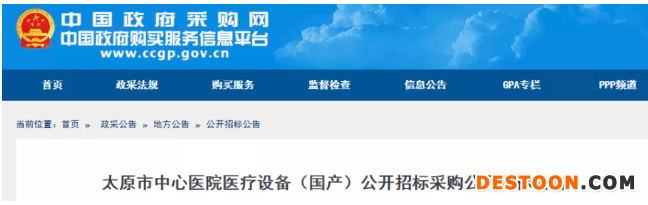 無(wú)獨(dú)有偶,就在4月7日太原市發(fā)布的《關(guān)于醫(yī)療設(shè)備(國(guó)產(chǎn))采購(gòu)的公開(kāi)招標(biāo)公告》中,太原市政府表示將以5450000元的采購(gòu)預(yù)算,為太原市人民醫(yī)院新院區(qū)醫(yī)療設(shè)備國(guó)產(chǎn)設(shè)備采購(gòu)。