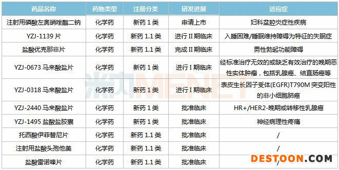 YZJ-1139片是食欲素1和2型雙重受體的高效拮抗劑,通過抑制食欲素受體從而改善睡眠,目前正在進(jìn)行II期臨床;鹽酸優(yōu)克那非片是一款PDE-5抑制劑,由吉林大學(xué)研發(fā),天士力申報(bào)臨床,揚(yáng)子江開展臨床研究,目前已完成治療勃起功能障礙的II期臨床,9月17日揚(yáng)子江提交該新藥補(bǔ)充申請獲得CDE承辦受理;YZJ-0673馬來酸鹽片是一種泛PI3K抑制劑,國內(nèi)尚無同靶點(diǎn)藥物獲批上市,揚(yáng)子江的產(chǎn)品正在進(jìn)行I期臨床,用于晚期惡性實(shí)體腫瘤;YZJ-0318馬來酸鹽片為第三代表皮生長因子(EGFR-TKI)受體抑制劑,能夠選擇性的抑制T790M耐藥突變,目前正在開展I期臨床。