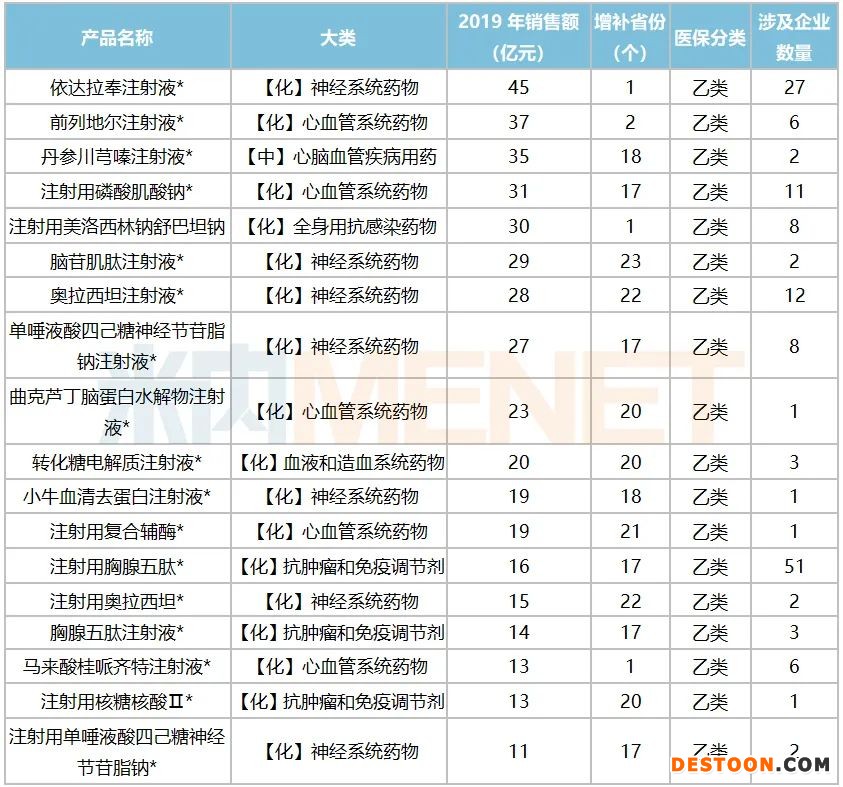 此外,在這些非獨家產(chǎn)品中,已經(jīng)進(jìn)入了省級醫(yī)保的數(shù)量少于10個的產(chǎn)品,若成功進(jìn)入國家醫(yī)保目錄則能瞬間推廣至全國,銷售量有望發(fā)生井噴式增長。我們密切關(guān)注鹽酸多柔比星脂質(zhì)體注射液、注射用環(huán)磷腺苷葡胺的動態(tài)。