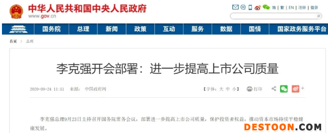 9月25日訊 提高上市公司質(zhì)量,對(duì)于促進(jìn)資本市場(chǎng)健康發(fā)展和拉動(dòng)實(shí)體產(chǎn)業(yè)轉(zhuǎn)型升級(jí)至關(guān)重要。9月23日,國(guó)務(wù)院常務(wù)會(huì)議召開,針對(duì)進(jìn)一步提高上市公司質(zhì)量工作進(jìn)行部署,旨在保護(hù)投資者權(quán)益,推動(dòng)資本市場(chǎng)持續(xù)平穩(wěn)健康發(fā)展。
