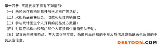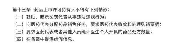 在這一要求之下,文件提出,食品藥品監(jiān)管部門要加強(qiáng)對(duì)醫(yī)藥代表的管理,建立醫(yī)藥代表登記備案制度,備案信息及時(shí)公開。醫(yī)藥代表只能從事學(xué)術(shù)推廣、技術(shù)咨詢等活動(dòng),不得承擔(dān)藥品銷售任務(wù),其失信行為記入個(gè)人信用記錄。